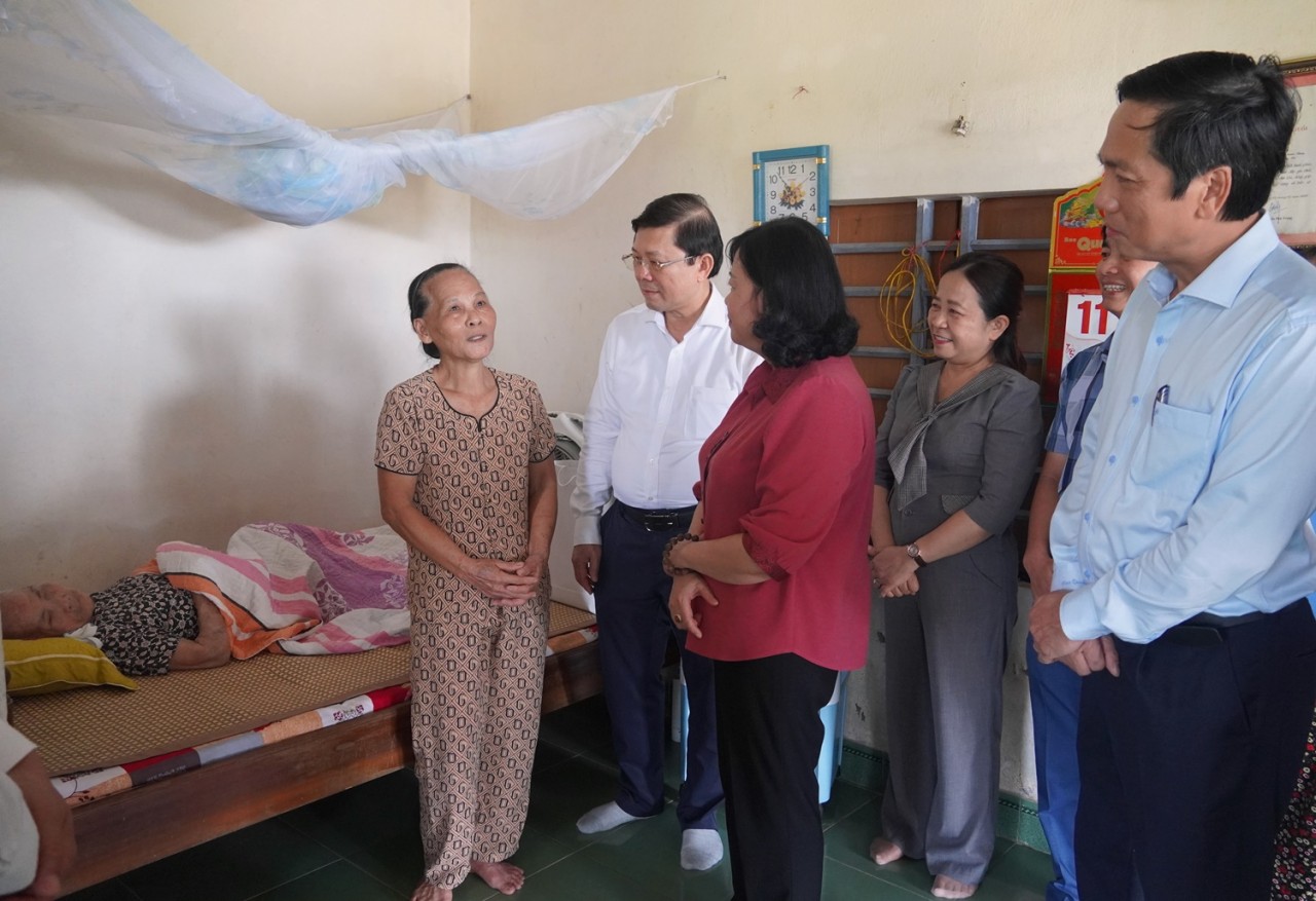 | Trưởng Ban Dân vận Trung ương Bùi Thị Minh Hoài cùng đoàn công tác thăm, tặng quà cho ông Nguyễn Tiến Giang, cán bộ cách mạng tiền khởi nghĩa - (Ảnh: Hồng Hà/quangtri.gov.vn). |
