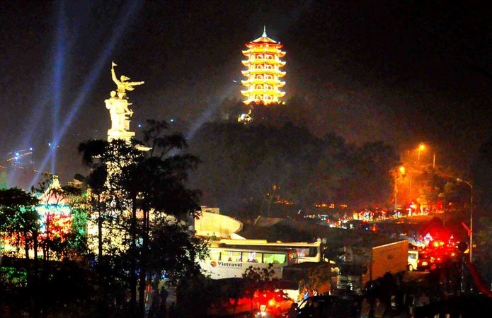 | Tháp chuông Đồng Lộc rực đỏ khi màn đêm buông xuống - (ảnh tư liệu) |