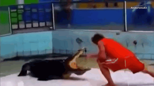 | Khi đang biểu diễn, một người đàn ông đã bị con cá sấu dài 3 mét ngoạm trúng tay rồi quật ngã. |