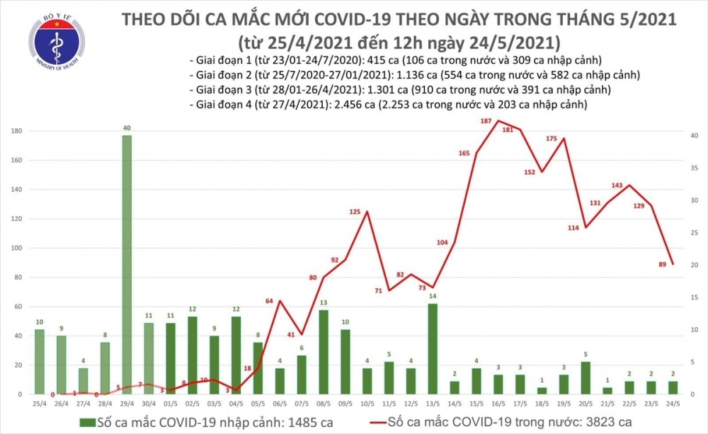 | Tính đến sáng 24/5, Bộ Y tế cho biết có thêm 58 ca mắc COVID-19, trong đó 2 ca nhập cảnh đã cách ly ngay; 56 ca còn lại ghi nhận trong nước tại 6 tỉnh, thành phố, riêng Bắc Giang đã 33 ca. |