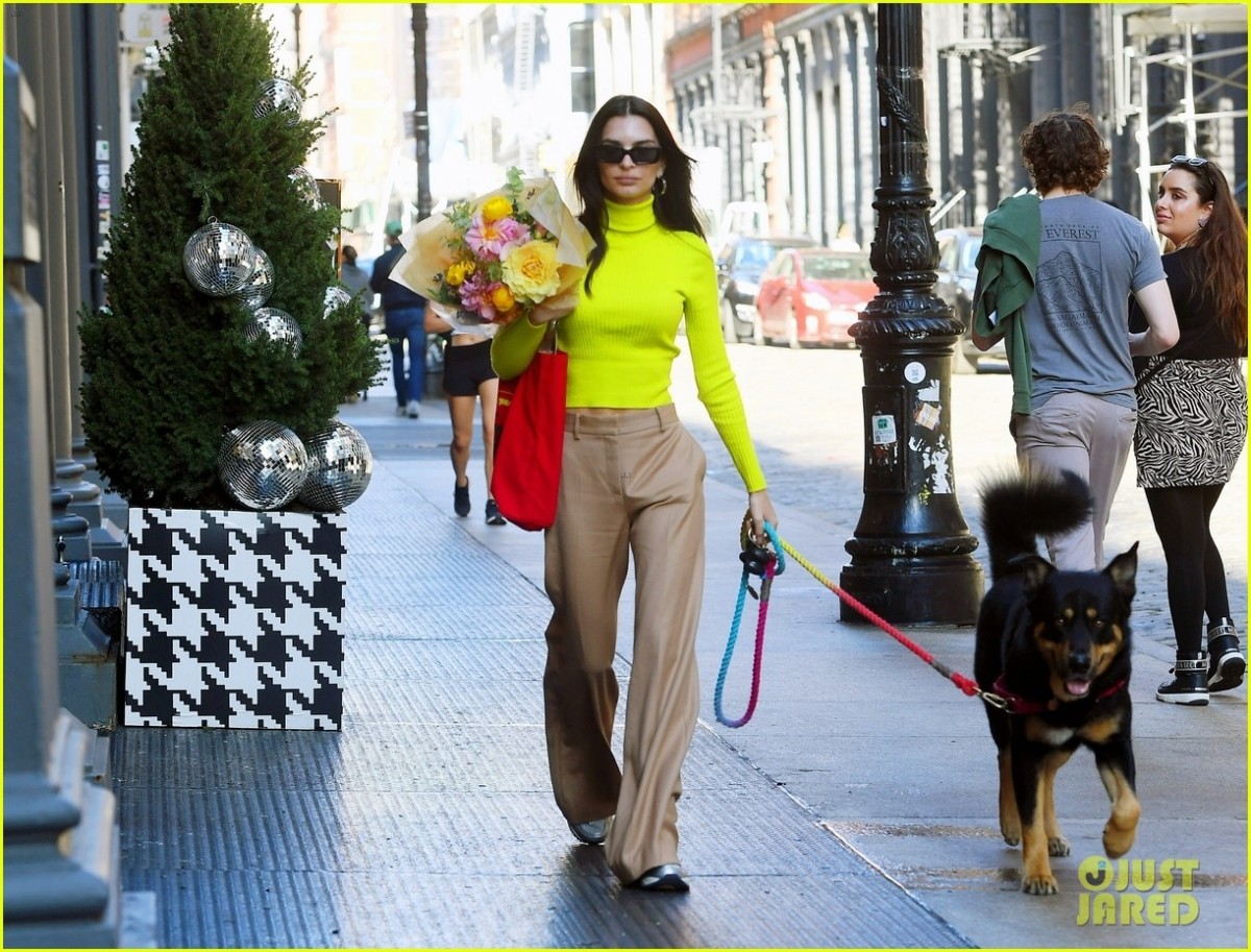 Emily Ratajkowski được nhìn thấy ghé vào một cửa hàng để mua hoa trong lúc đang dắt thú cưng đi dạo phố ở New York mới đây. Người đẹp trang điểm nhẹ nhàng, diện áo len và quần suông sành điệu.