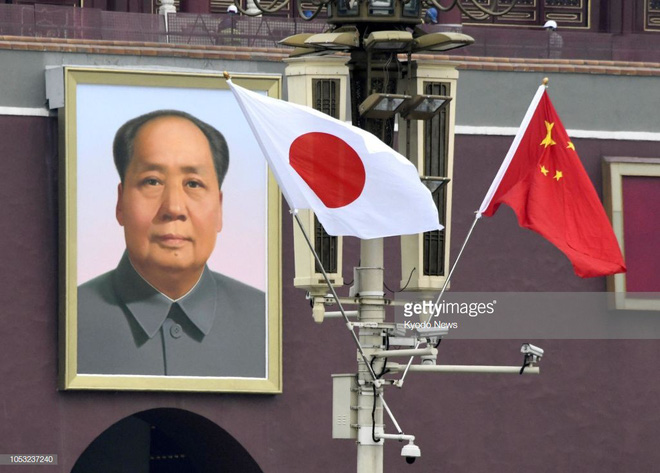 Quốc kỳ Nhật Bản và Trung Quốc được treo ở quảng trường Thiên An Môn nhân chuyến thăm của Thủ tướng Shinzo Abe. Ảnh: Kyodo