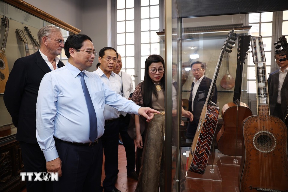 | Thủ tướng Phạm Minh Chính và Phu nhân xem hiện vật về nghệ thuật chế tác dụng cụ âm nhạc trưng bày tại Bảo tàng lịch sử và nghệ thuật Palais Lascaris. (Ảnh: Dương Giang/TTXVN) |