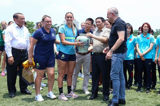 | Thủ tướng động viên, tặng quà Đội tuyển nữ U20 Australia đang thi đấu vòng loại thứ 2 Cúp Bóng đá nữ U20 châu Á 2024 tại Việt Nam (Ảnh: VGP/Nhật Bắc). |