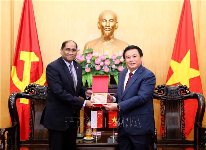 | Giám đốc Học viện Chính trị quốc gia Hồ Chí Minh Nguyễn Xuân Thắng tiếp Đại sứ Singapore tại Việt Nam Jaya Ratnam. Ảnh: Văn Điệp/TTXVN |