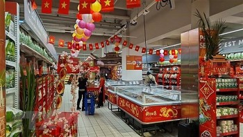 | Gian hàng Việt Nam được trang trí nổi bật ngay tại hành lang chính của siêu thị Carrefour Lyon, bên cạnh các gian bán sản phẩm của một số nước châu Á khác. |