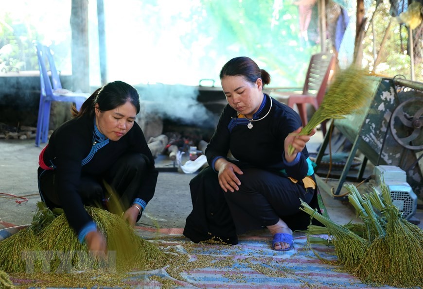 | Những bông lúa sau khi được thi hoạch về sẽ được đập thủ công để cho những hạt lo, già rơi ra mới đảm bảo cho cốm Bắc Hà có thương hiệu đến ngày hôm nay (Ảnh: Quốc Khánh/TTXVN). |