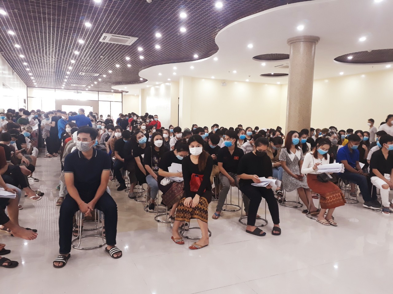 | Các lưu sinh viên Lào tập trung chờ đến lượt tiêm vắc xin phòng Covid-19. |