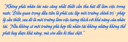 Có những lĩnh vực cần khuyến khích người tiềm ẩn tài năng đi ra nước ngoài để có cơ hội toả sáng. Đến thời điểm phù hợp họ biết cách phụng sự Tổ quốc. Vấn đề quan trọng ở đây, chính là “cơ chế thu phục” cái tâm của họ hướng về Tổ quốc, để khi có bất kỳ điều kiện nào, thì họ phát huy hết tài năng cống hiến cho đất nước.