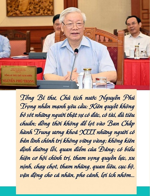 Nói về chọn cán bộ Tổng Bí thư, Chủ tịch nước Nguyễn Phú Trọng đã nhấn mạnh yêu cầu: Kiên quyết không bỏ sót những người thật sự có đức, có tài, đủ tiêu chuẩn; đồng thời không để lọt vào Ban Chấp hành Trung ương khoá XIII những người có một trong những khuyết điểm sau: (1) Bản lĩnh chính trị không vững vàng; không kiên định đường lối, quan điểm của Đảng; có biểu hiện cơ hội chính trị, tham vọng quyền lực, xu nịnh, chạy chọt, tham nhũng, quan liêu, cục bộ, vận động cho cá nhân, phe cánh, lợi ích nhóm; thiếu chính kiến, thấy đúng không bảo vệ, thấy sai không đấu tranh; (2) Vi phạm nguyên tắc tập trung dân chủ, mị dân, chuyên quyền, độc đoán; không công bằng, công minh trong đánh giá, sử dụng cán bộ, trù dập người thẳng thắn đấu tranh, phê bình; (3) Để nội bộ mất đoàn kết nghiêm trọng hoặc để xảy ra tham nhũng, thất thoát, vụ việc tiêu cực lớn ở địa phương, cơ quan, đơn vị; (4) Không chịu nghiên cứu học hỏi; bảo thủ, trì trệ, làm việc kém hiệu quả, nói nhiều làm ít, nói không đi đôi với làm; ý thức kỷ luật kém, không chấp hành sự điều động, phân công của tổ chức, uy tín giảm sút; (5) Ý thức kỷ luật kém, không chấp hành sự điều động, phân công của tổ chức, uy tín thấp. (6) Kê khai tài sản không trung thực, có biểu hiện giàu nhanh, nhiều nhà, nhiều đất, nhiều tài sản khác mà không giải trình rõ được nguồn gốc; bản thân hoặc vợ, chồng, con có lối sống thiếu gương mẫu, lợi dụng chức quyền để thu lợi bất chính. (7) Vi phạm quy định về lịch sử chính trị hoặc chính trị hiện nay.