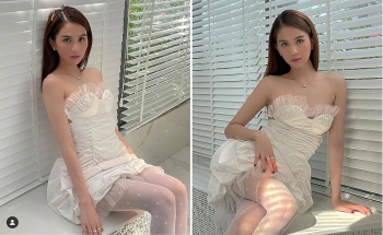 | Xuất hiện trong bộ ảnh thời trang đầu năm mới, Ngọc Trinh diện dáng váy trắng cúp ngực với thần thái vừa gợi cảm lại vừa quý phái. |