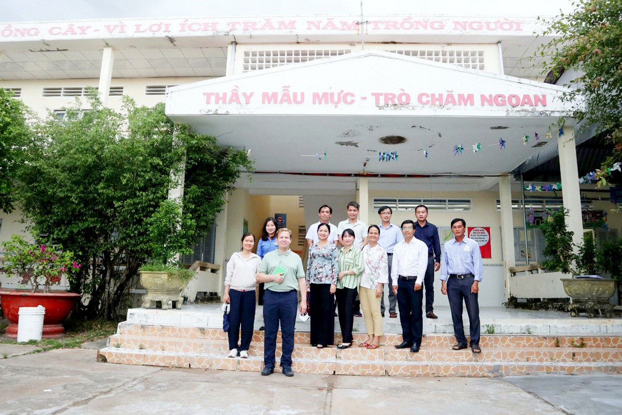 | Đoàn khảo sát và chụp hình lưu niệm tại Trường tiểu học xã Đất Mới, huyện Năm Căn. |
