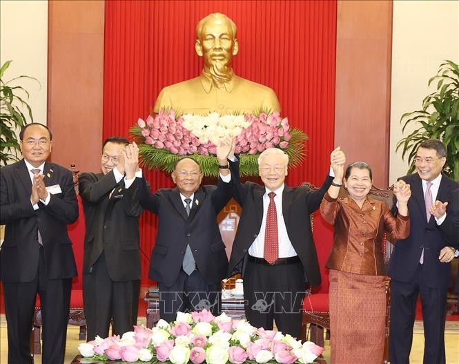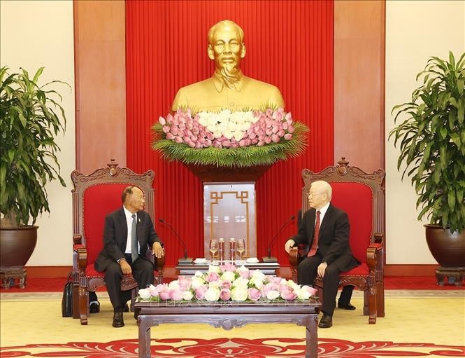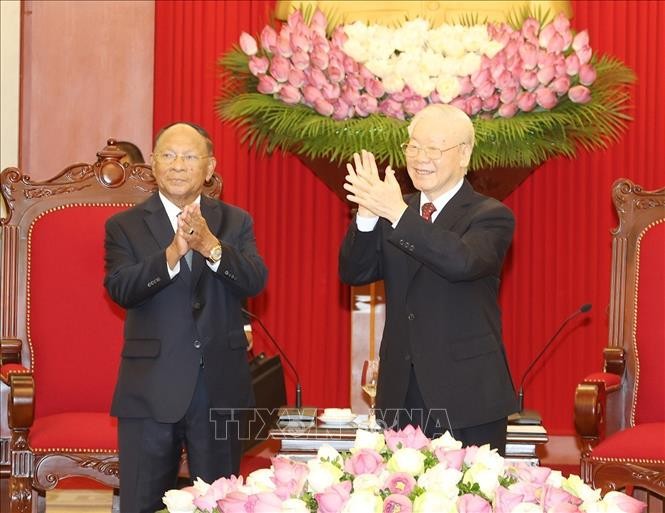 | Tổng Bí thư Nguyễn Phú Trọng tiếp Chủ tịch Danh dự Đảng Nhân dân Campuchia, Chủ tịch Quốc hội Vương Quốc Campuchia Samdech Heng Samrin (Ảnh: TTXVN). |