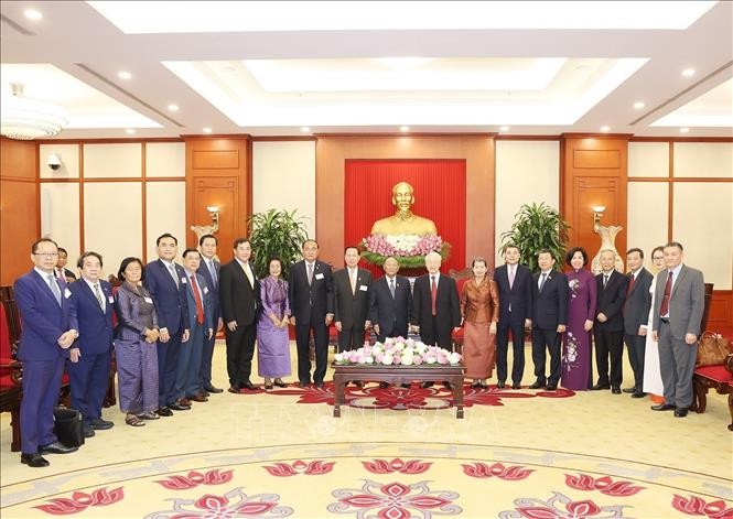 | Tổng Bí thư Nguyễn Phú Trọng và Chủ tịch Danh dự Đảng Nhân dân Campuchia, Chủ tịch Quốc hội Campuchia Samdech Heng Samrin chụp ảnh chung với các đại biểu (Ảnh: TTXVN). |