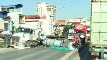 Tránh người đi xe máy bị ngã, container lao xuống vệ đường