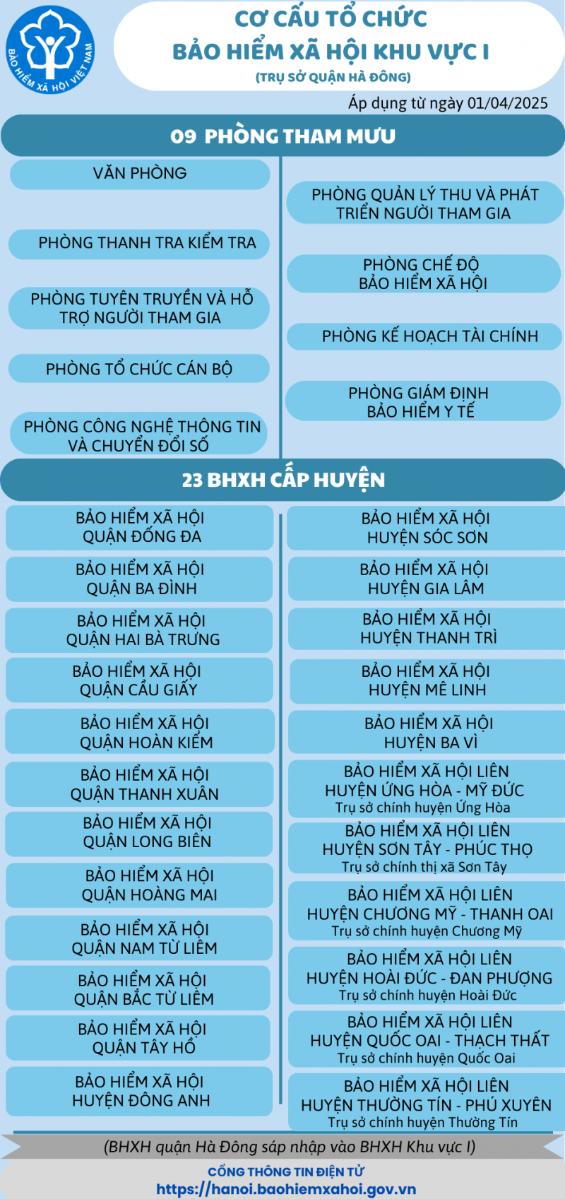 Trước đó, Quyết định số 46/QĐ-BHXH, BHXH Việt Nam đã quy định chức năng, nhiệm vụ, quyền hạn của BHXH cấp huyện kể từ ngày 1/4/2025. Cụ thể, BHXH Khu vực I sẽ bao gồm 9 Phòng tham mưu và 23 BHXH cấp huyện.