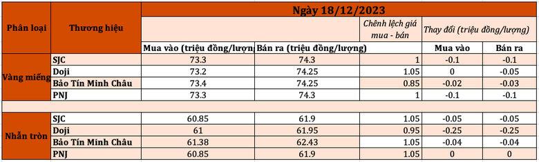 Diễn biến giá vàng tại một số doanh nghiệp lớn sáng ngày 18/12. Tổng hợp: Linh Linh