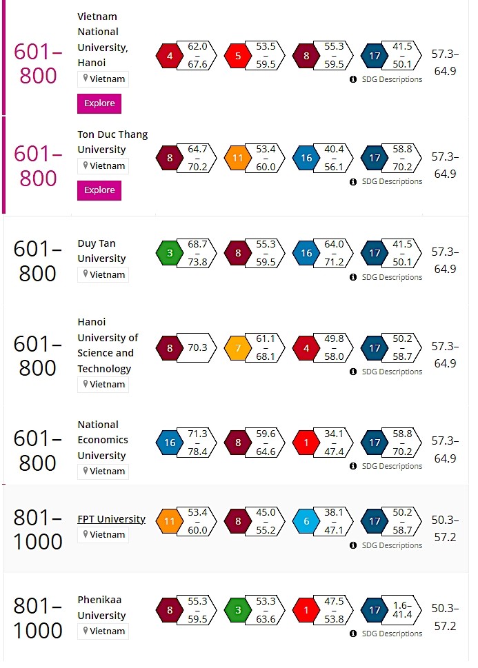 Cả 7 cơ sở giáo dục đại học của Việt Nam đều được xếp hạng cao ở SDG số 8 (Tăng trưởng kinh tế và việc làm bền vững). Trong đó, Trường Đại học Bách khoa Hà Nội có thứ hạng cao nhất với 70.3 điểm. Tuy nhiên, duy nhất Đại học Quốc gia Hà Nội có thứ hạng cao ở SDG số 4 (Giáo dục có chất lượng), với 63.1 điểm. Trong khi đó, SDG số 11 (Thành phố và cộng đồng bền vững) là 1 trong 3 chỉ số nổi bật của Trường Đại học FPT và Trường Đại học Tôn Đức Thắng; SDG số 16 (Hòa bình, công bằng và thể chế vững mạnh) là thế mạnh của Trường Đại học Kinh tế quốc dân, Trường Đại học Tôn Đức Thắng và Trường Đại học Duy Tân.