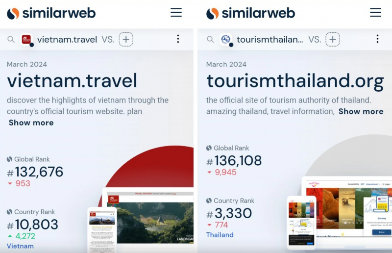 | Theo Similarweb đánh giá, xếp hạng trang web quảng bá du lịch quốc gia vietnam.travel của Cục Du lịch quốc gia Việt Nam đã vượt qua website du lịch của Thái Lan, xếp trên nhiều quốc gia khác trong khu vực. |