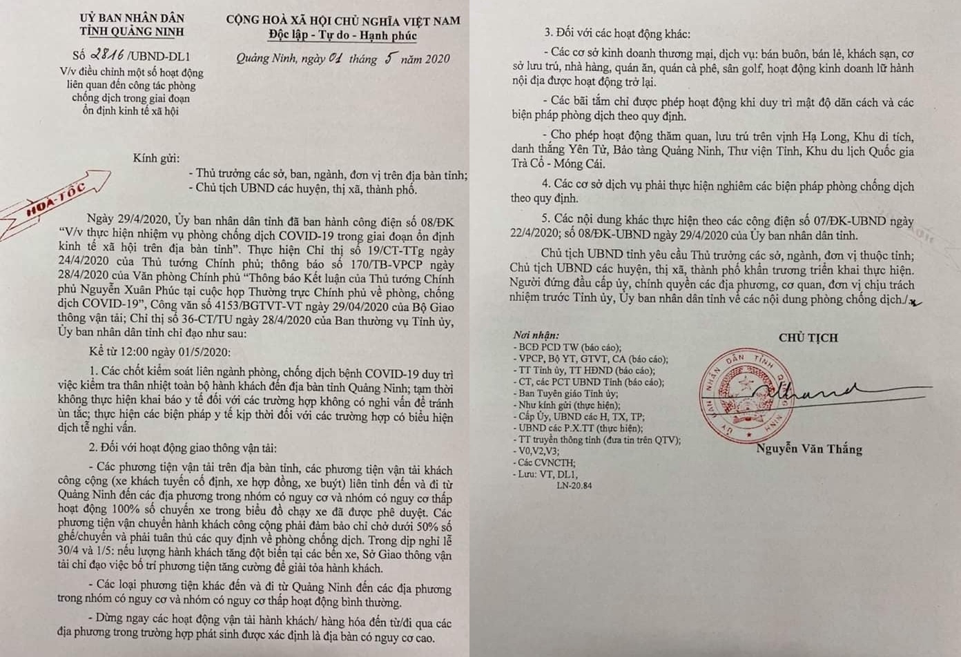Ngày 1/5, UBND tỉnh Quảng Ninh chỉ đạo về việc điều chỉnh một số hoạt động liên quan đến công tác phòng chống dịch Covid-19 trong giai đoạn ổn định kinh tế xã hội.
