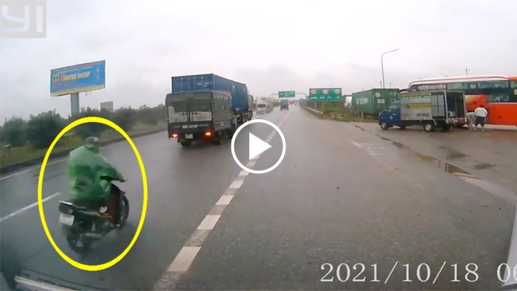 Theo hình ảnh trích xuất được từ camera hành trình gắn trên ô tô dừng bên đường, thời điểm nói trên, một xe máy phóng nhanh trên làn đường hỗn hợp trên cao tốc Hà Nội – Bắc Giang. Khi vừa vượt ô tô gắn camera hành trình, người đàn ông điều khiển xe máy phát hiện phía trước có một xe tải nhỏ đang di chuyển ở làn bên trái bất ngờ lách sang phải để vượt một container.